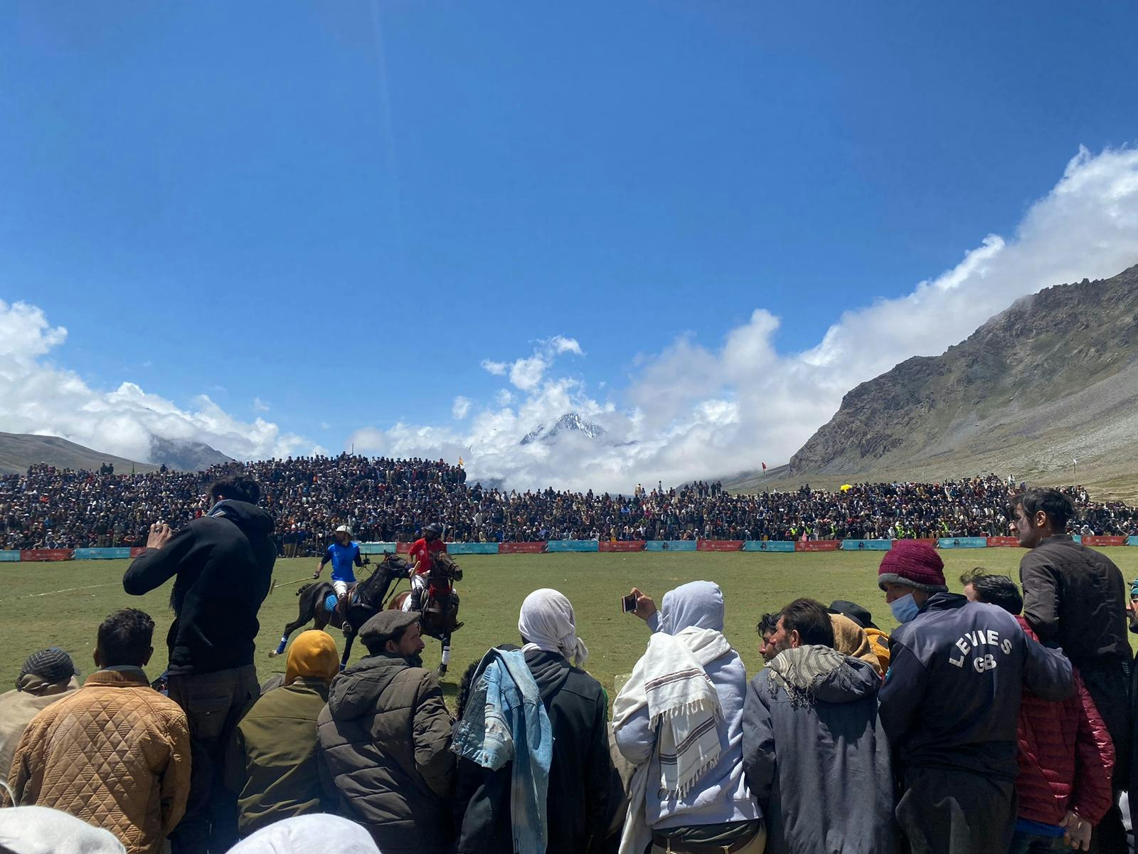Cโest une รฉtendue dโherbe plus ou moins plate, entourรฉe de gradins construits avec les cailloux des plateaux environnants. Dans la pure tradition du polo ร la pakistanaise, le terrain fait le quart de la taille voulue par les normes officielles, et les hommes des montagnes viennent par milliers assister au spectacle.